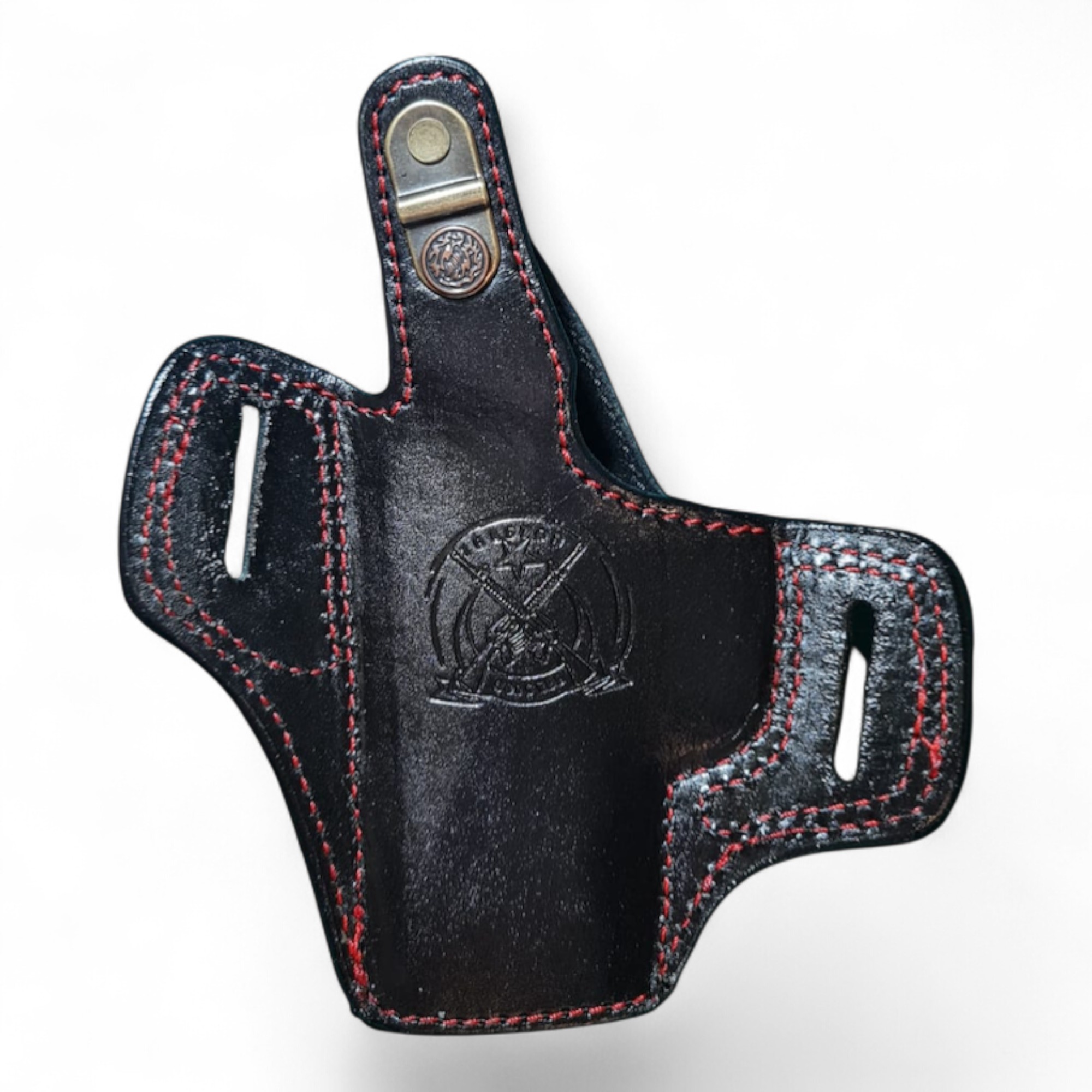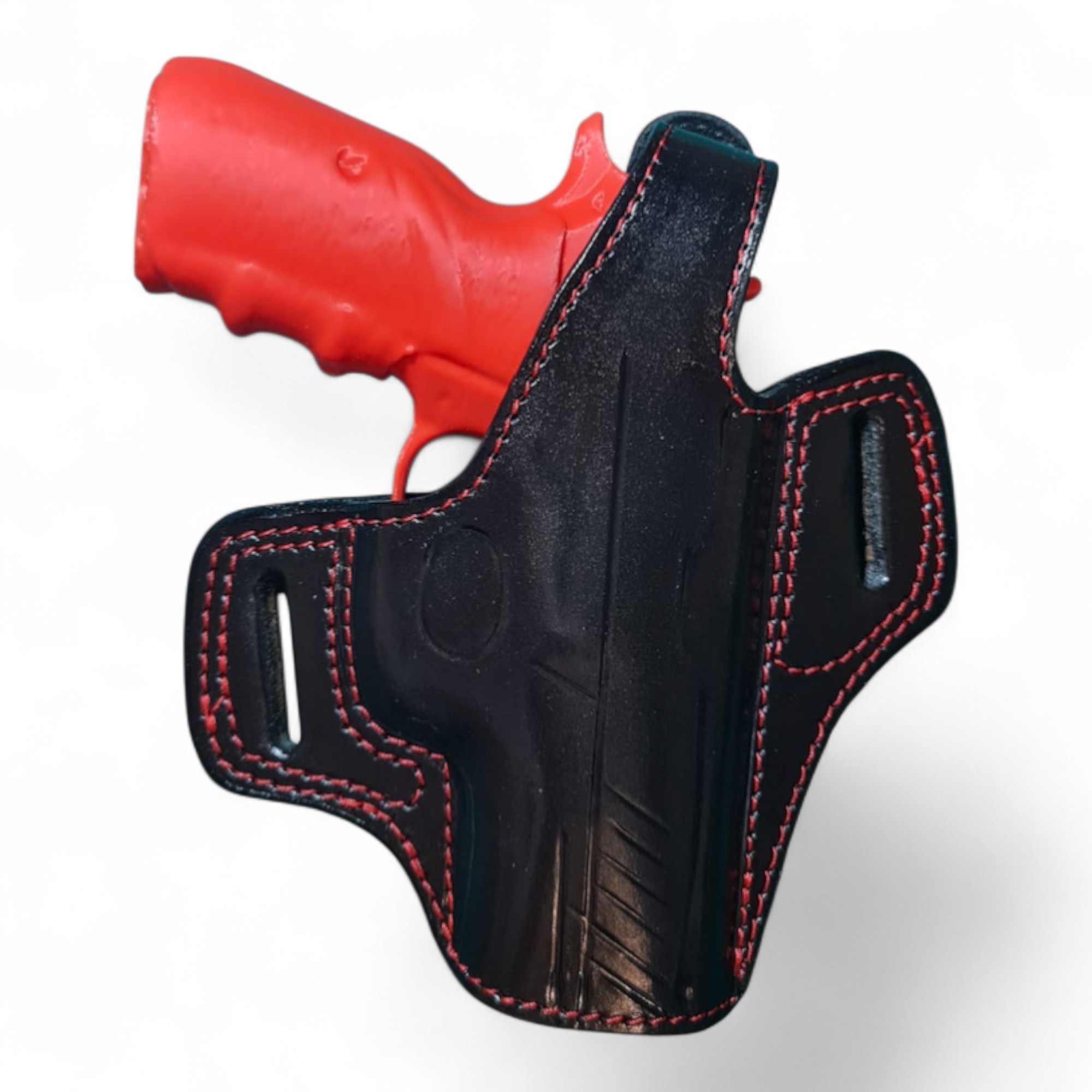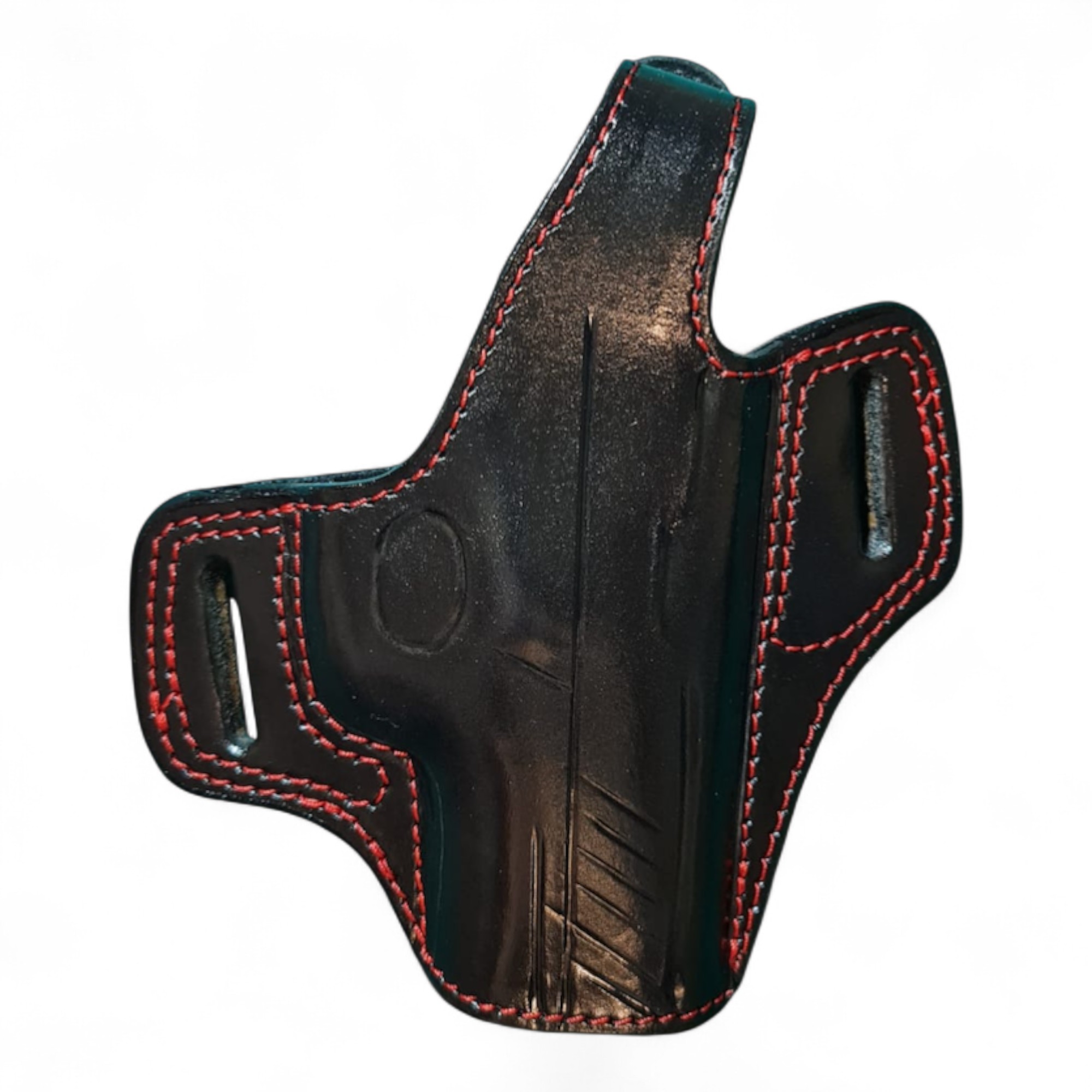 Deri Dış Silah Kılıfı; spor karakterli tasarımı, dikkat çekici kırmızı makine dikişleri ve kırmızı kadife iç kaplaması ile estetik ve fonksiyonelliği bir arada sunan özel üretim bir dış taşıma (OWB) kılıfıdır.
