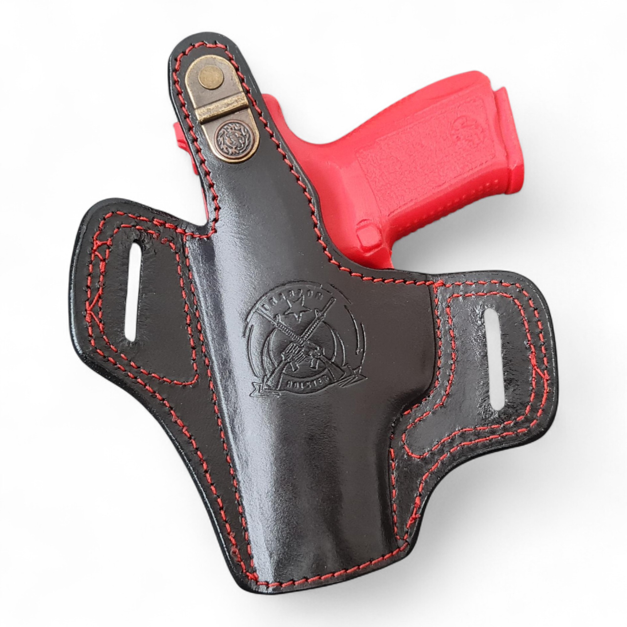 Deri Dış Silah Kılıfı; spor karakterli tasarımı, dikkat çekici kırmızı makine dikişleri ve kırmızı kadife iç kaplaması ile estetik ve fonksiyonelliği bir arada sunan özel üretim bir dış taşıma (OWB) kılıfıdır.