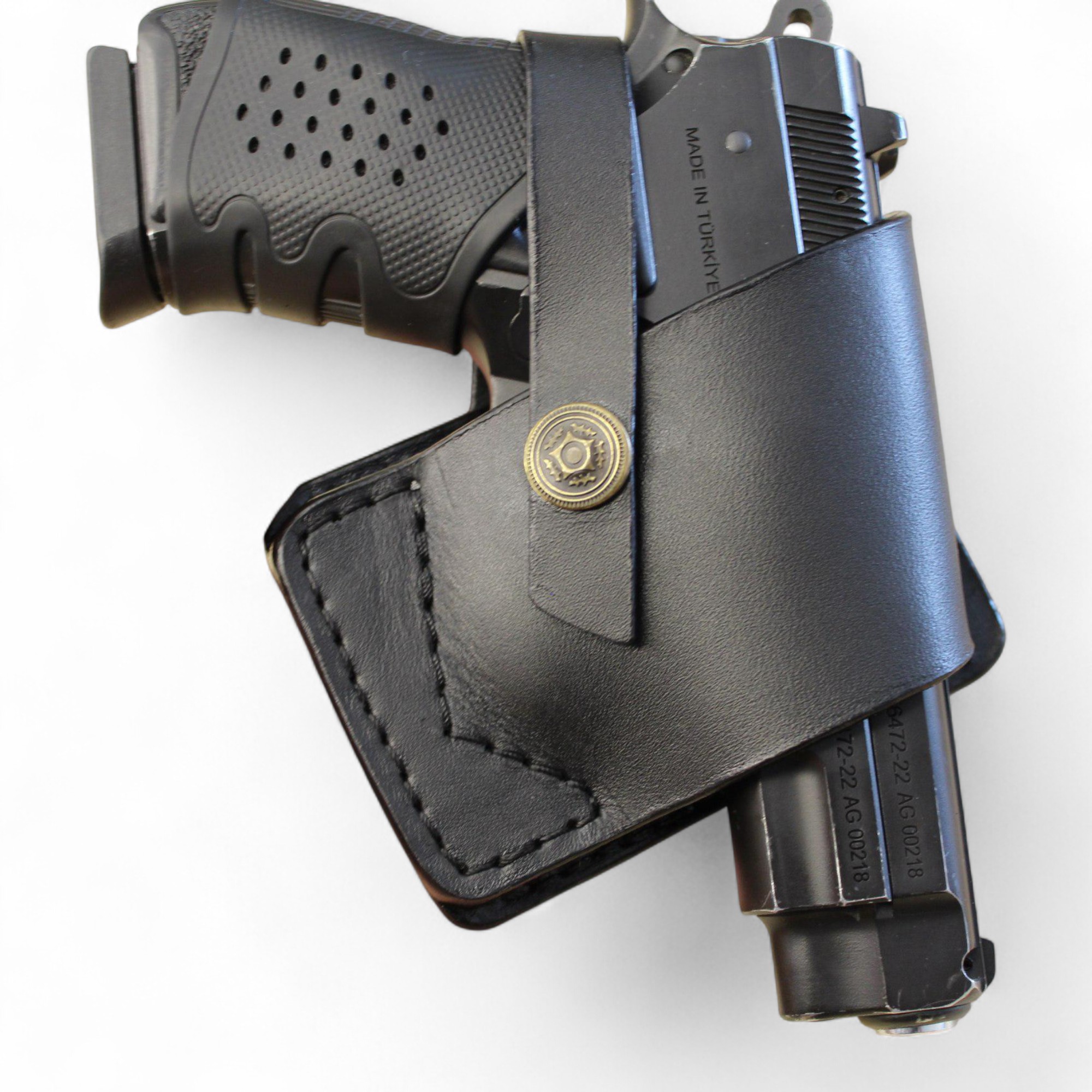 Klasik deri estetiğini güvenli taşıma geometrisiyle birleştiren bu yapı; kemer üzerinde dengeli konumlanır, silahı vücuda kontrollü şekilde yakın tutar ve aktif kullanımda stabilite sağlar.