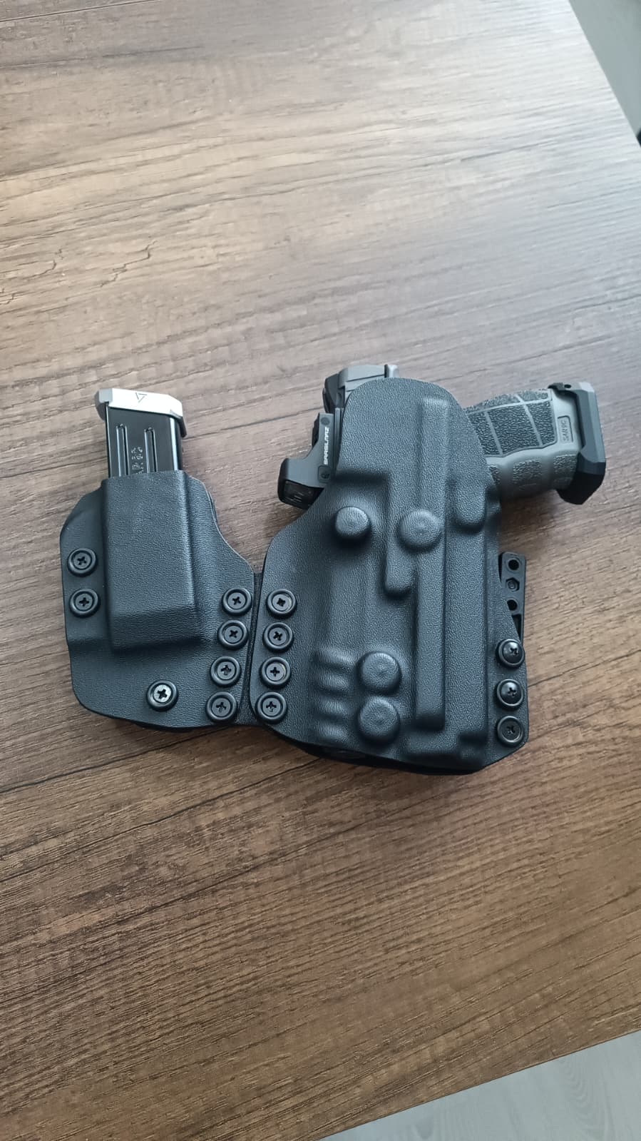 Kılıf üzerinde yer alan çoklu ayar vidaları, silahın kılıf içerisindeki tutuş sertliğini hassas şekilde ayarlamaya imkân tanır. Böylece ne fazla sıkı ne de gevşek; tam kararında bir çekim direnci elde edilir. Bu yapı, hem güvenliği hem de hızlı erişimi destekler.