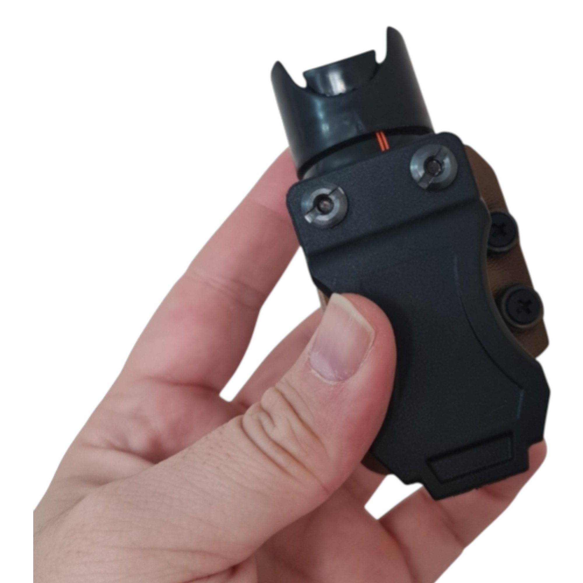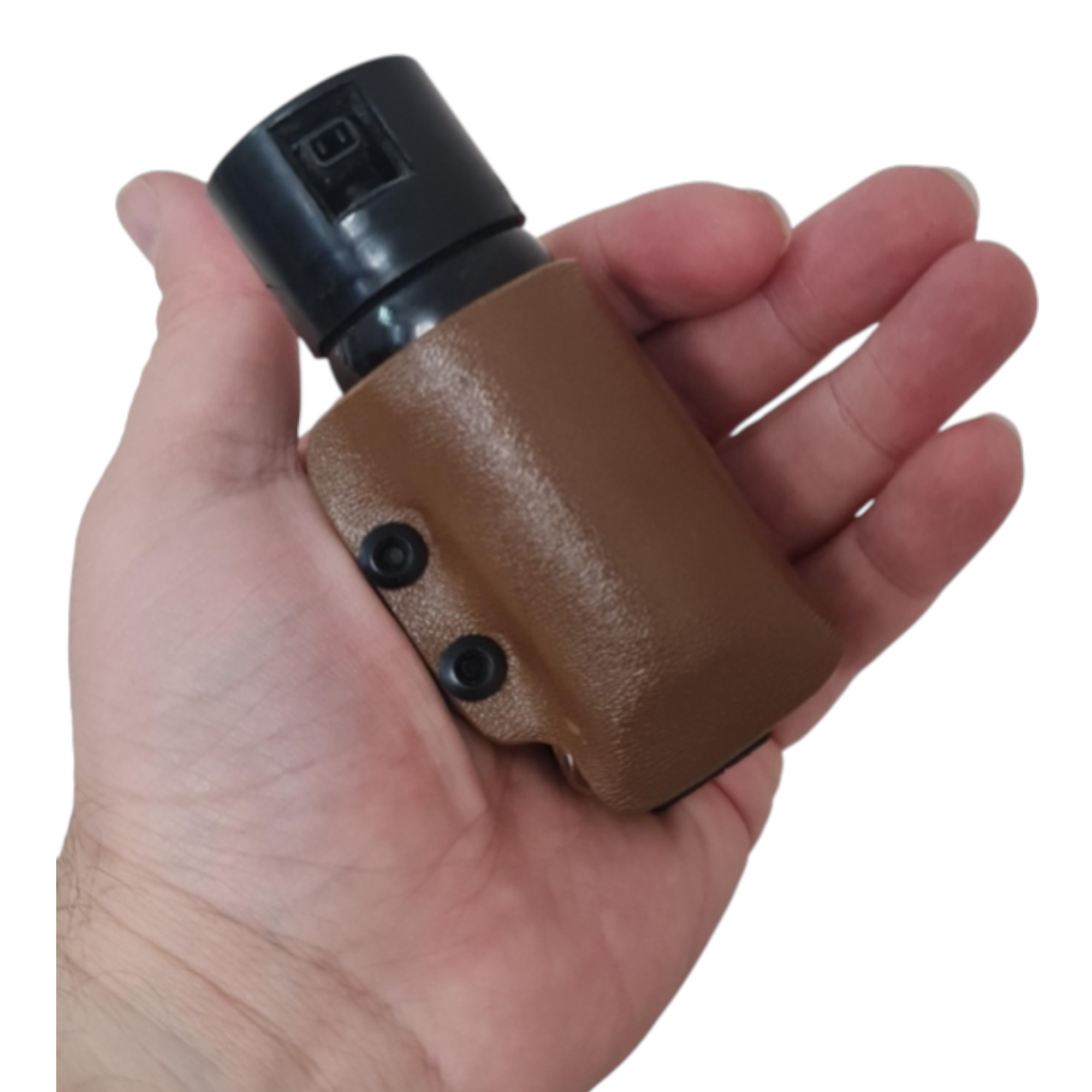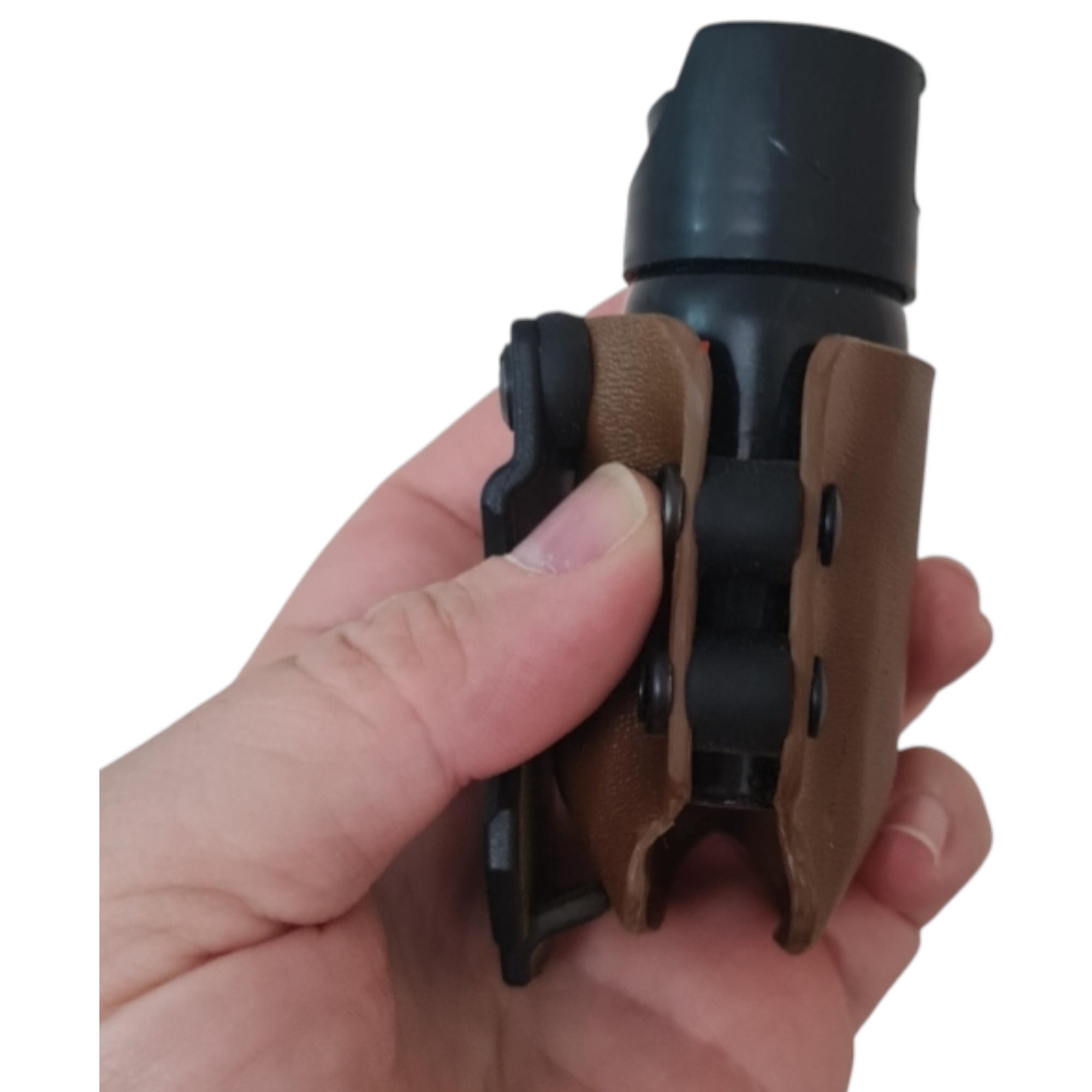 Sert KYDEX yapısı sayesinde biber gazı tüpünü sabit şekilde muhafaza ederken, taşıma sırasında istemsiz çıkmaları engeller. Kompakt formu ve dengeli taşıma geometrisi ile kemer üzerinde veya ekipmanla entegre şekilde her an erişilebilir bir konumda taşınmasına imkân tanır.