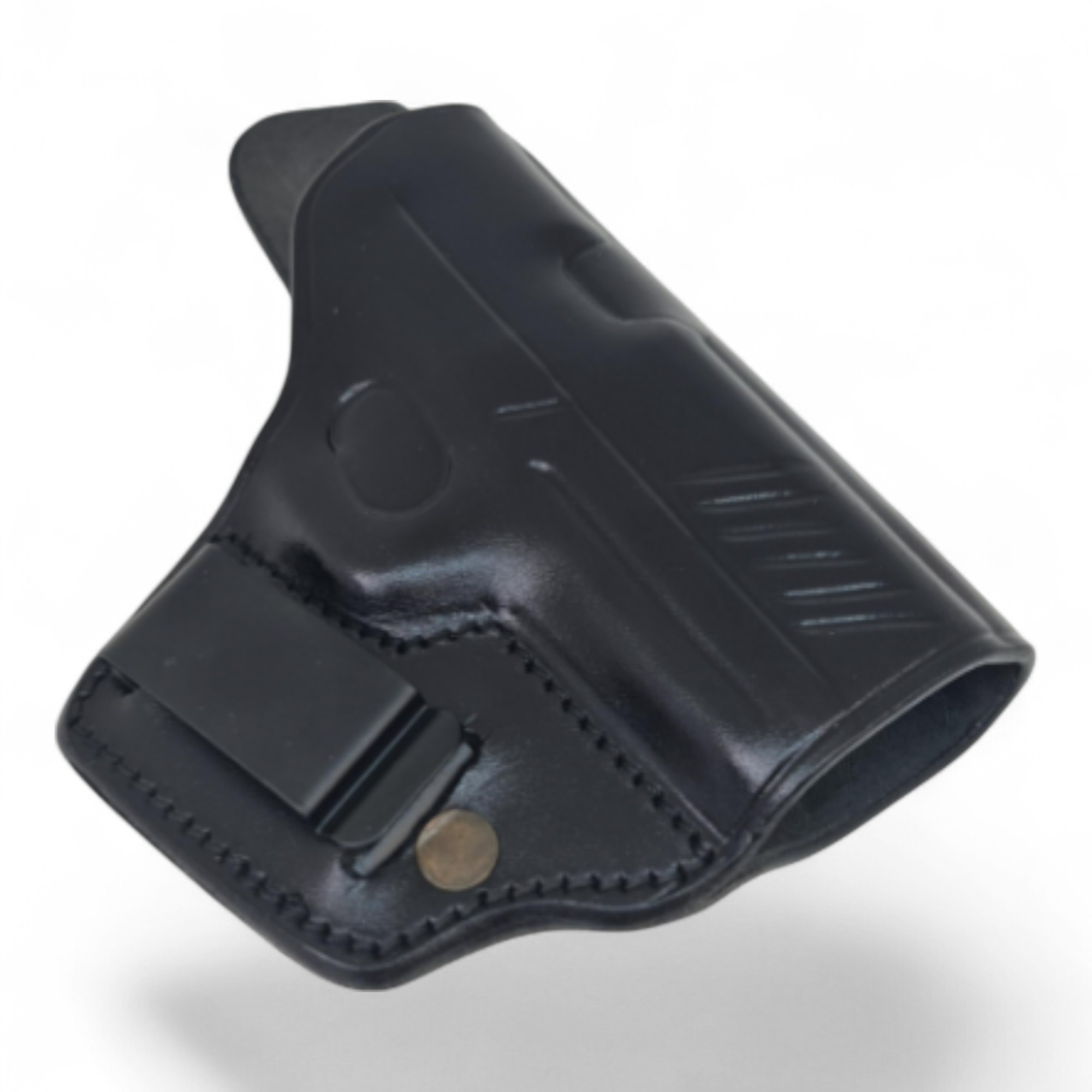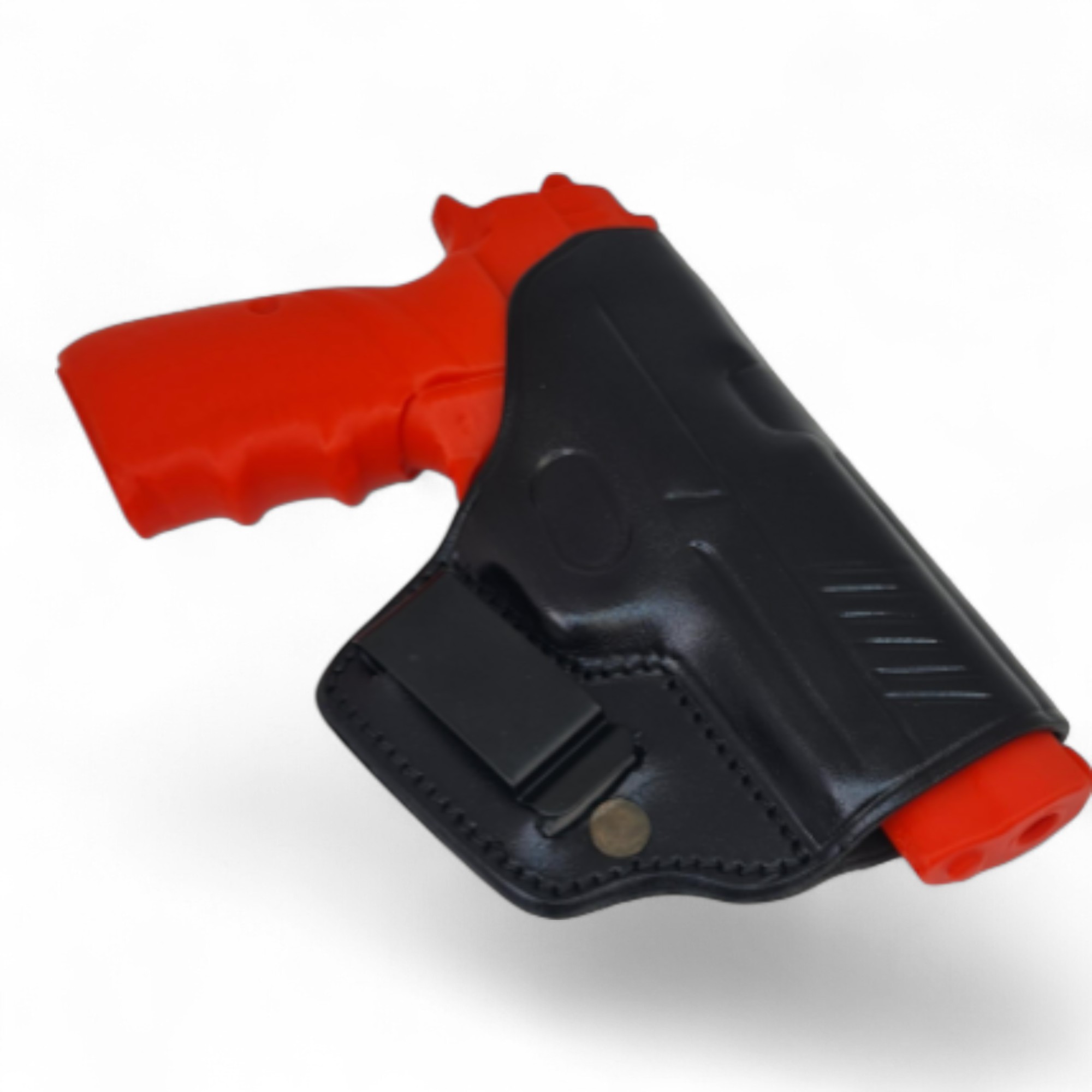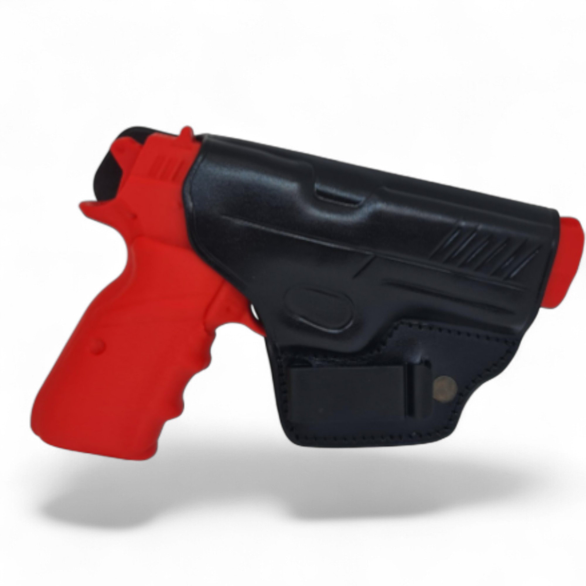 - Deri iç Tabanca kılıfı olarak da kullanılabilen kılıfımız kasık üstüne veya belde metal maşa ile dıştan kemere tutturularak sağ el kullanıcıları için kullanım imkanları sunar.