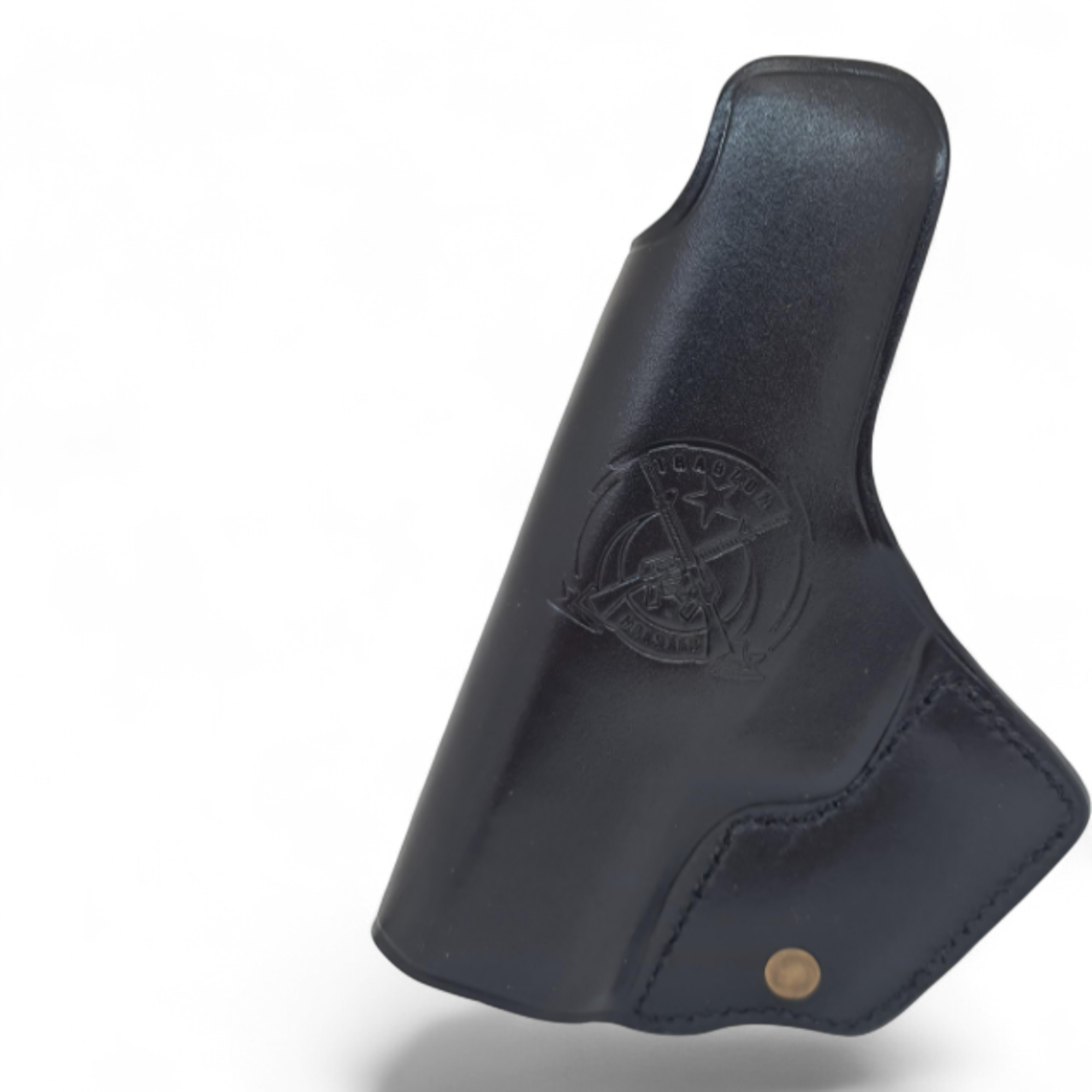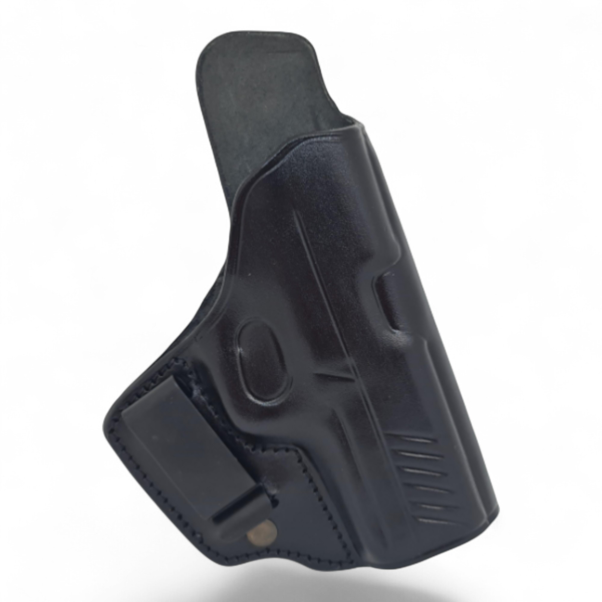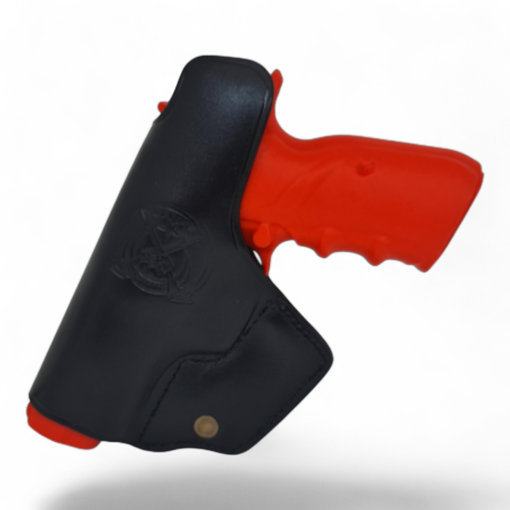 - Deri iç Tabanca kılıfı olarak da kullanılabilen kılıfımız kasık üstüne veya belde metal maşa ile dıştan kemere tutturularak sağ el kullanıcıları için kullanım imkanları sunar.